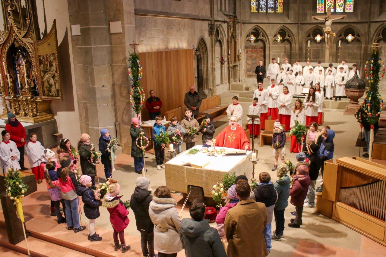 Evangelische und katholische Christen erinnern an diesem Tag an den Einzug Jesu in Jerusalem. Er ritt auf einem Esel und wurde vom Volk als Friedenskönig jubelnd empfangen mit den Worten „gesegnet sei, der kommt im Namen des Herrn, der König Israels.“ (Joh. 12) Viele Menschen breiteten ihre Kleider aus, rissen Zweige von den Büschen und Bäumen ab, darunter auch Palmen und legten sie auf den Weg. Auch heute noch begrüßen wir Jesus mit sog. „Palmen“. Zahlreiche Kinder brachten ihre kunstvollen, mit Buchs, Thuja und Eibenzweigen sowie Eiern und farbigen Bändern geschmückten „Palmen“ vors Münster, wo sie wegen der Bauarbeiten in diesem Jahr auf dem Platz vor dem Pfarramt von Pfarrer Jürgen Rieger gesegnet wurden. Unter dem Gesang der Münstersängerknaben zogen die Gläubigen in feierlicher Prozession in die Kirche ein. Pfarrer Rieger erklärte den Kindern den Ablauf der Karwoche und meinte dann, der Jubel des „Hosianna dem Sohne Davids“ beim Einzug in Jerusalem werde bald vom Geschrei des „kreuzige ihn“ abgelöst.