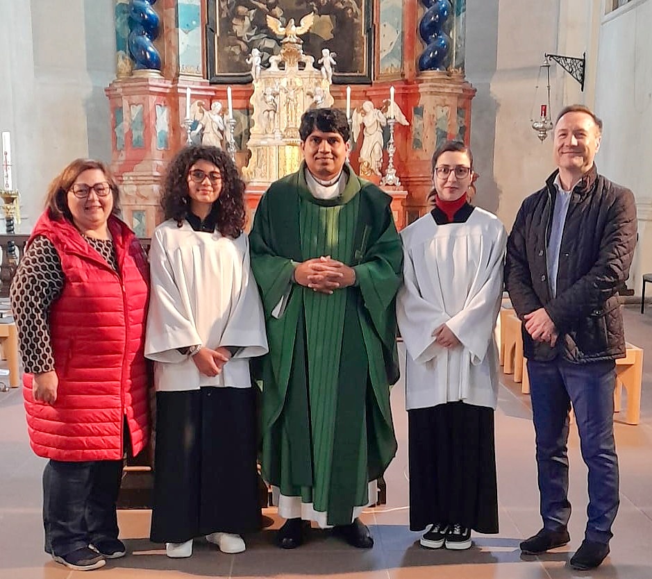 (hil) Die muttersprachlich italienische Gemeinde Sacro Cuore Rottweil hat nach längerer Vakanz wieder einen Pfarrer. Dr. Mattus Jose stammt aus Kerala, Indien. Er studierte in Indien Philosophie und Theologie. 2014 ging er nach Rom, um seinen Doktor am Päpstlichen Orientalischen Institut zu machen. Seit 9. September 2025 ist er Pfarrer der italienischen Gemeinde in Tuttlingen und der italienischen Gemeinde in Rottweil. Am vergangenen Sonntag wurde er in der Kapellenkirche herzlich von Romina Karolewski und Oliver Renn im Namen der italienischen und der deutschen Gemeinde Auferstehung-Christi willkommen geheißen.