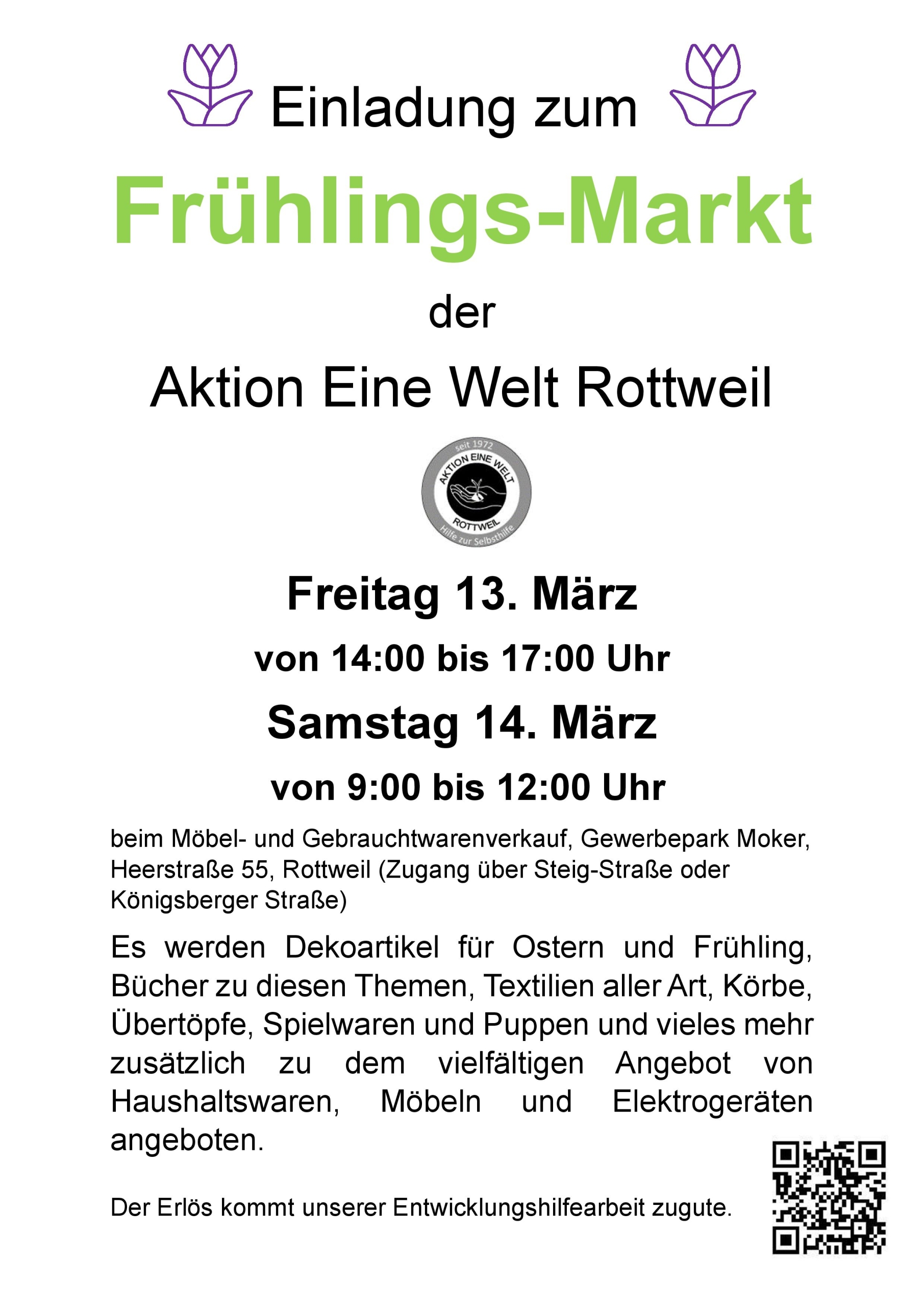 Die Aktion Eine Welt Rottweil lädt zu einem Frühlingsmarkt am Freitag, 13. März, von 14 bis 17 Uhr und am Samstag, 14. März, von 9 bis 12 Uhr in die Räumlichkeiten des Möbel- und Gebrauchtwarenverkauf, Gewerbepark Moker, Heerstraße 55, Rottweil herzlich ein.