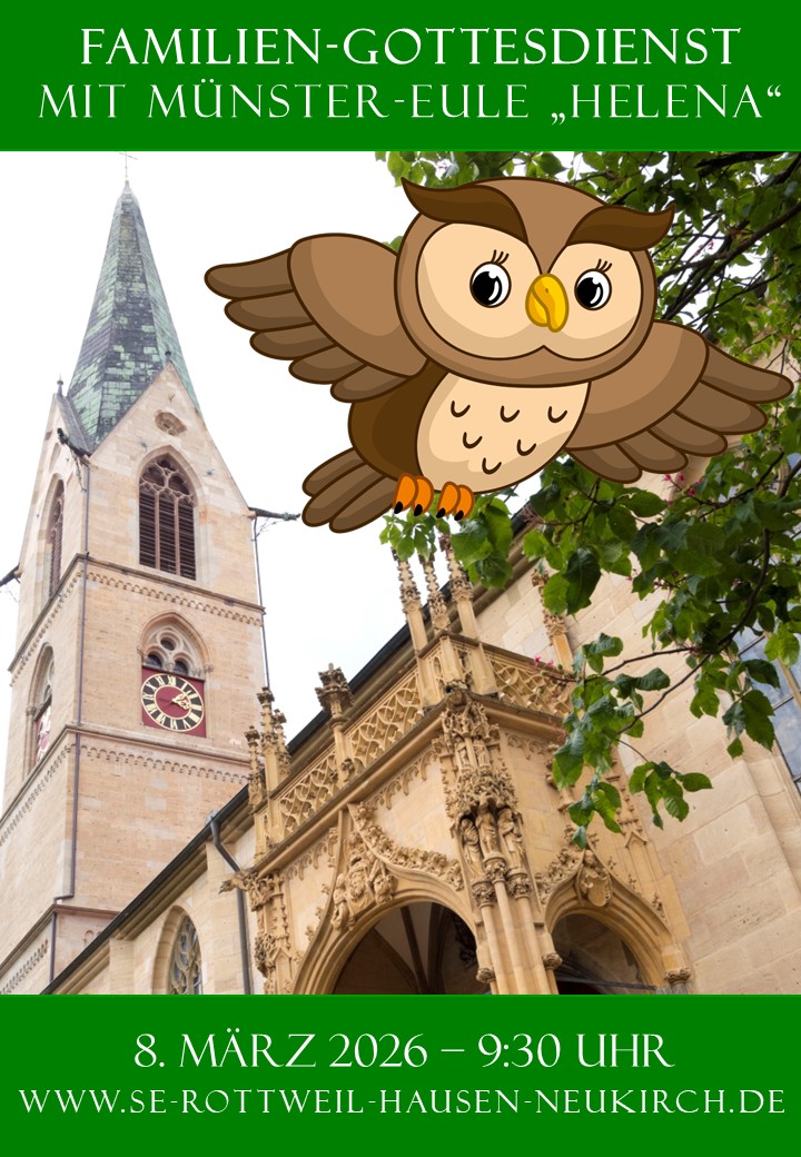 Zu einem Familiengottesdienst am 3. Fastensonntag, 8. März, um 9.30 Uhr im Heilig-Kreuz-Münster sind Jung und Alt eingeladen. Die vertraute Form der Eucharistiefeier wird auch von Kindern mitgestaltet. Kinderbänkle werden bereitgestellt. Es gibt auch eine Kinder-Mitmach-Aktion, bei der jedes Kind etwas mit nach Hause nehmen darf. Die Eule „Helena“ ist wieder bei der Predigt zu Gast.