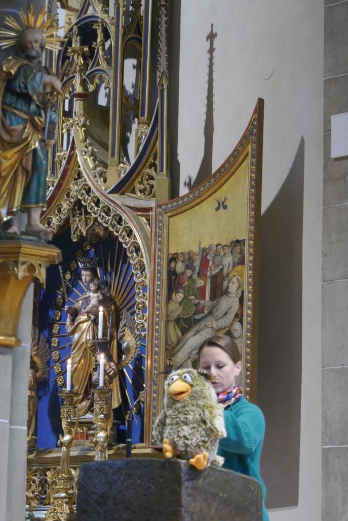 Die Eule „Helena“ kommt wieder zu Besuch ins Heilig-Kreuz-Münster beim Familiengottesdienst am 8. März.