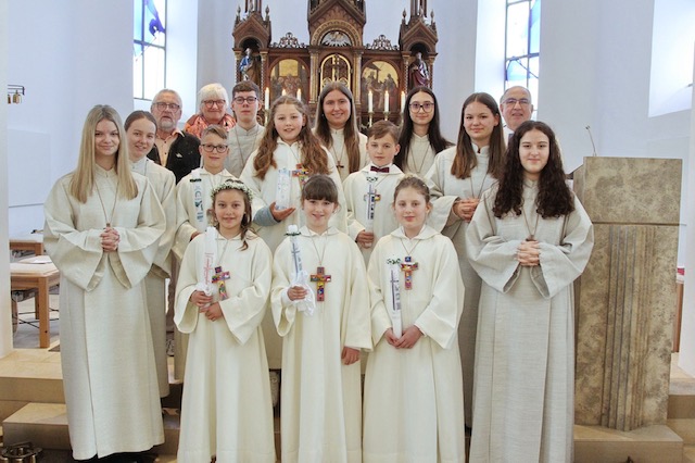 In einem feierlichen Gottesdienst, gehalten von Pfarrer Jürgen Rieger, gingen Marian Gaiss, Mina Hess, Lara-Marie Keller, Christian Keller, Ann Sophie Merz und Patricia Wuhrer am 12.04.2026 in St. Peter und Paul zum ersten Mal zur Heiligen Kommunion und erklärten damit ihren Glauben an Jesus Christus.