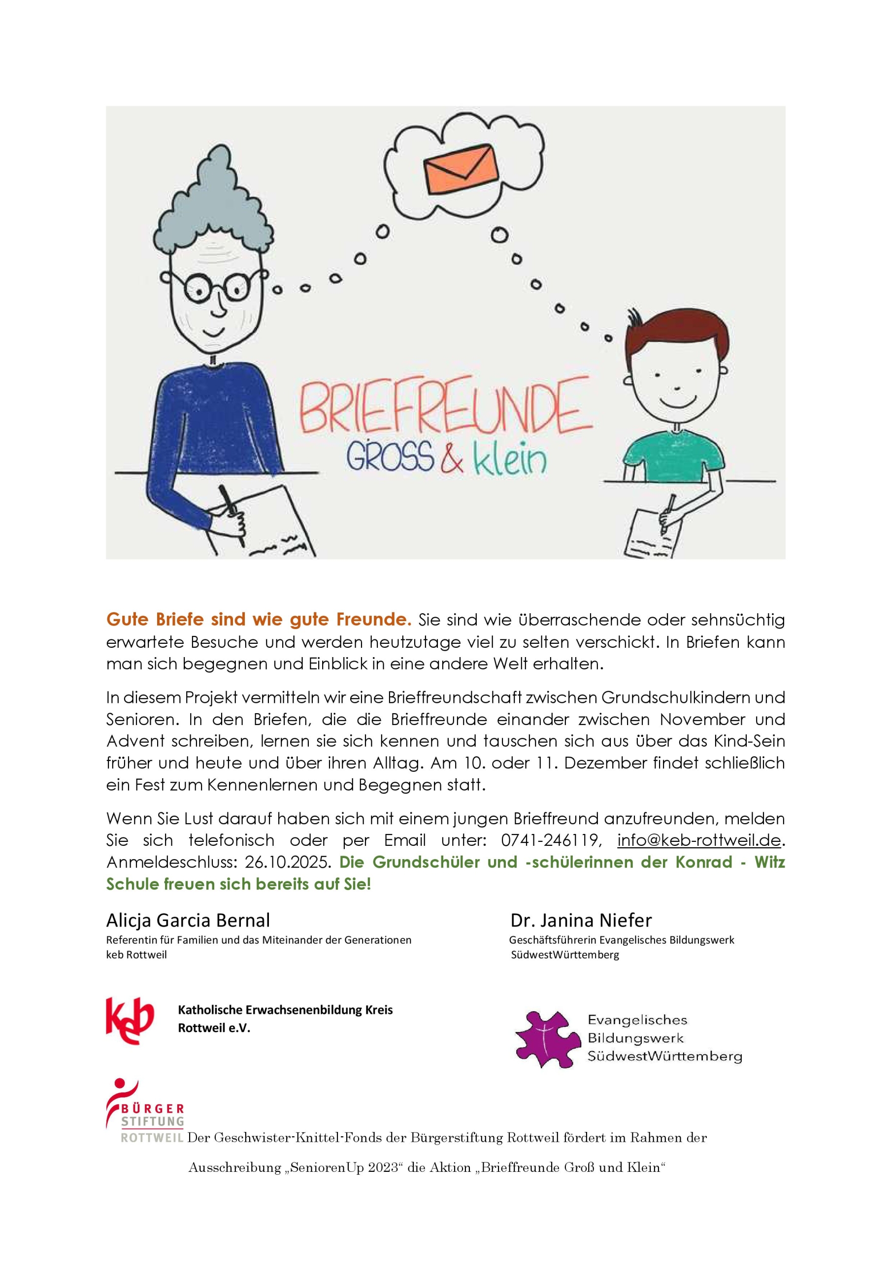 Die evangelische und katholische Erwachsenenbildung führen ihr Projekt weiter. An die 40 Grundschülerinnen und Grundschüler der Konrad-Witz Schule in Rottweil freuen sich auf eine Begegnung in Briefform mit einem Senior oder Seniorin. Die Brieffreundschaft ist zeitlich begrenzt und dauert von Oktober bis Mitte Advent.