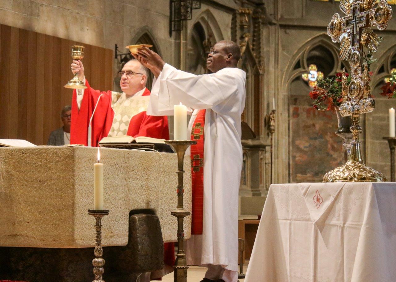 Pfarrer Jürgen Rieger zelebrierte die Messe zusammen mit Pater Yvon aus Benin, der zurzeit bei einem Gemeindemitglied zu Gast ist. Der Münsterchor gestaltete die Feier musikalisch. Er sang mehrstimmige Chorsätze aus dem Freiburger Chorbuch.