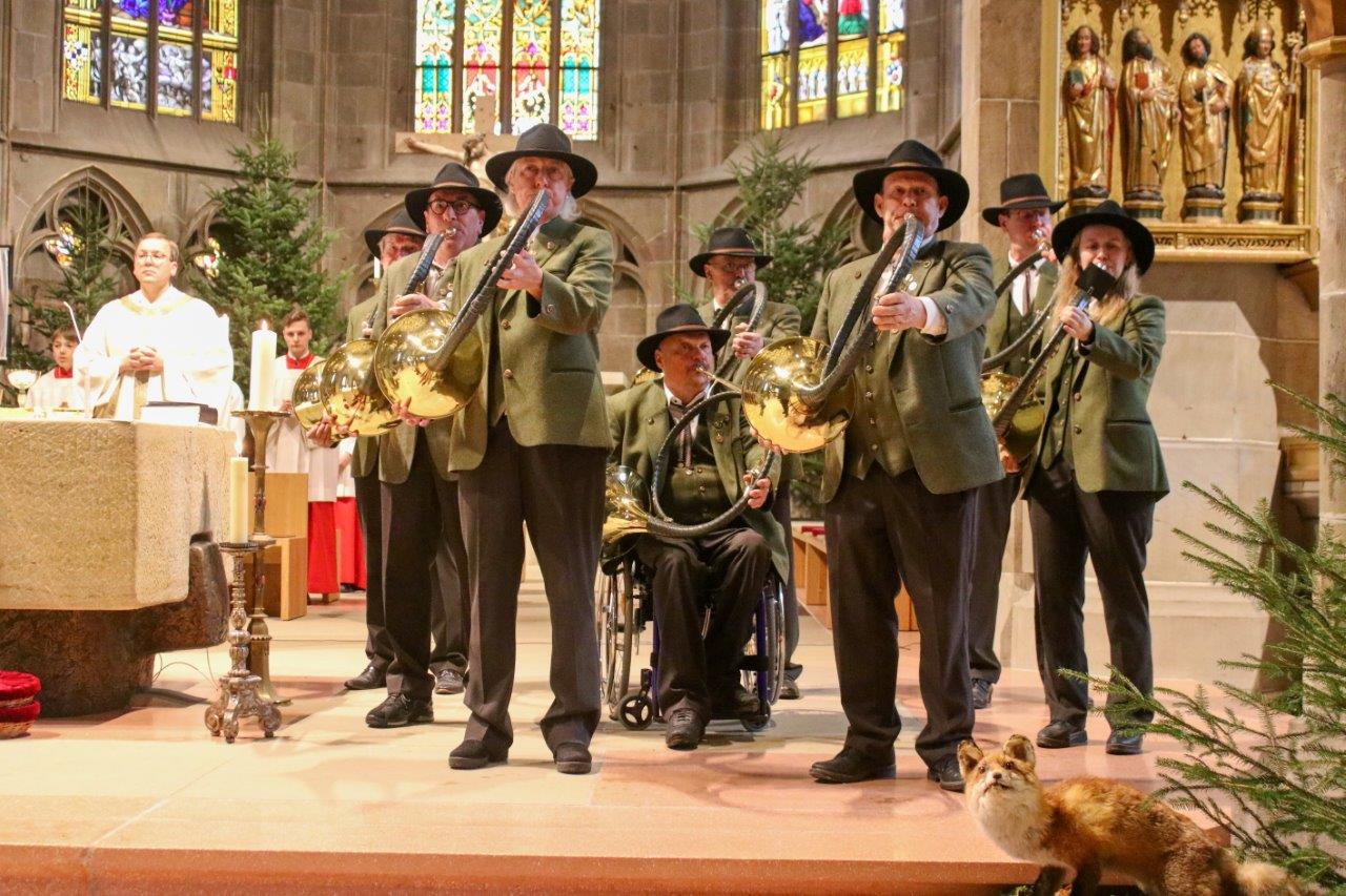 Das Team um Hegeringleiter Matthias Oettle hat für eine stimmungsvolle Deko in der Kirche gesorgt. Der Chorraum des Münsters war mit Bäumen geschmückt. Ein mächtiges Hirschgeweih mit Kreuz war vor dem Chor aufgebaut. Es erinnerte an die Legende, die dem Heiligen Hubertus zugeschrieben wird. Bei der Jagd war ihm ein Hirsch erschienen, der im Geweih ein strahlenumwobenes Kreuz trug. Vikar Nico Schmid hat die Messe zelebriert, die von den Parforcebläsern des Hegerings unter der Leitung von Eugen Schuler musikalisch begleitet wurde. Parforcehörner werden sonst vor allem zum Blasen von Jagdsignalen verwendet.