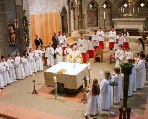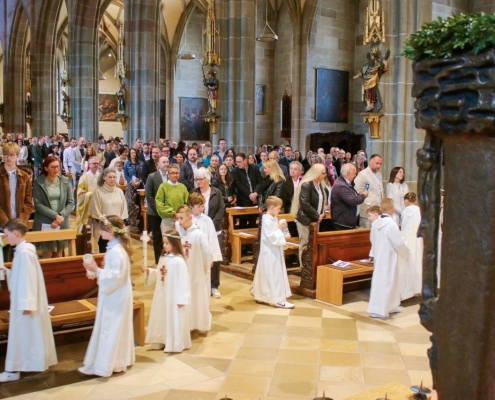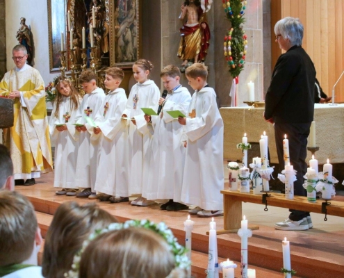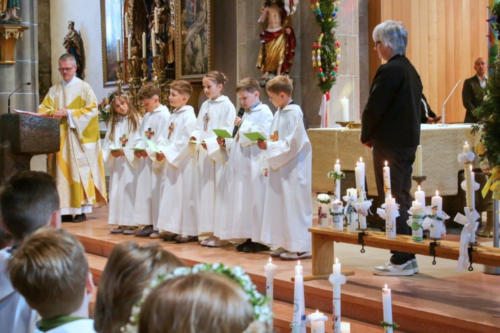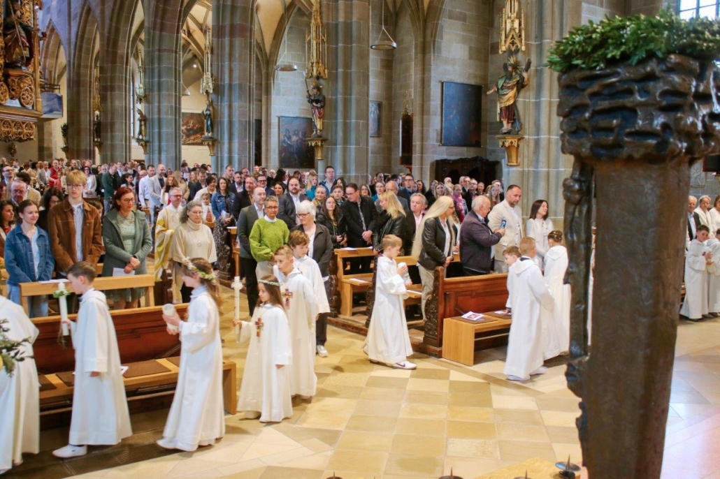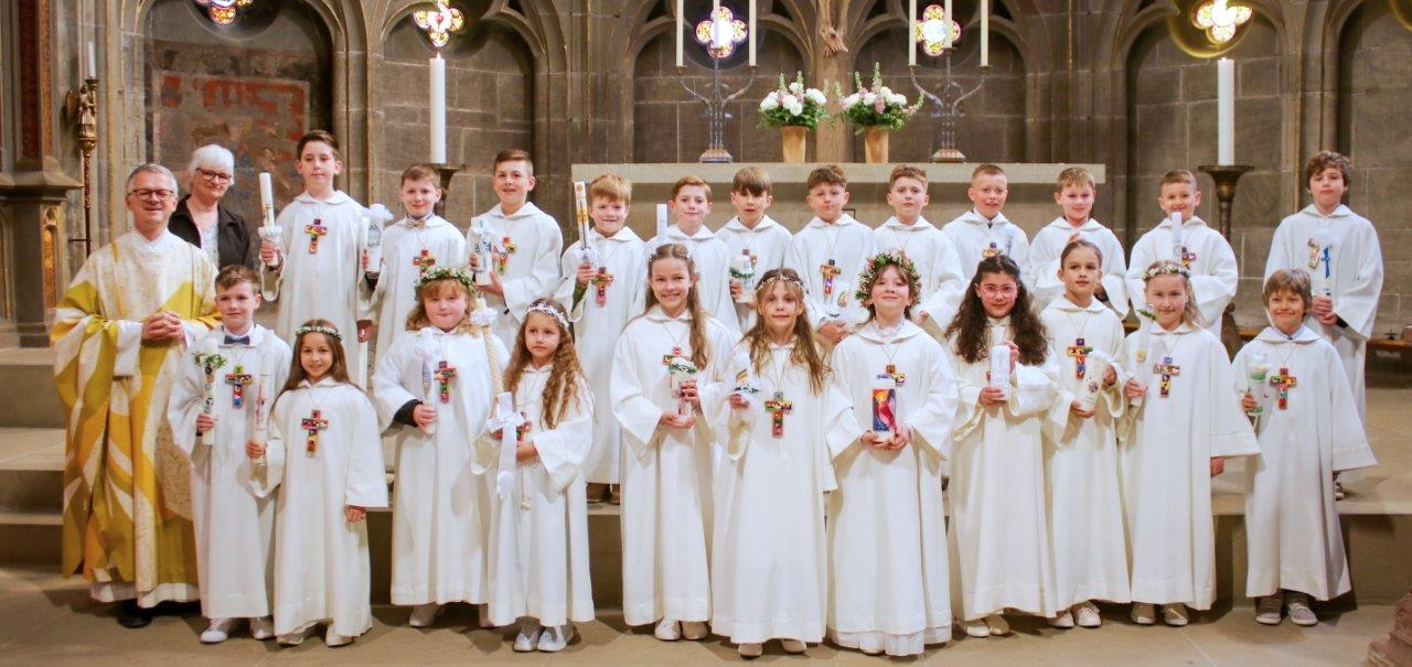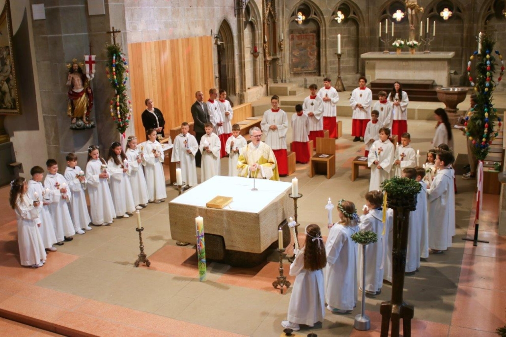 (hil) Mit dem feierlichen Einzug ins Heilig-Kreuz Münster begann am Sonntag der große Tag für 23 Erstkommunionkinder. Pfarrer Timo Weber feierte zusammen mit den Kindern, deren Familien, Gästen und der Gemeinde den Erstkommuniongottesdienst, der unter dem Leitwort stand „Jesus hat mich eingeladen.“ Das Erstkommunionteam der Pastoralen Mitarbeitenden hatte unter der Leitung von Vikar Nico Schmid ein neues Konzept entwickelt, bei dem die Kinder der dritten Grundschulklasse hauptsächlich in ihren Familien auf diesen Tag vorbereitet wurden. Zudem durften die Kommunionkinder einmal im Monat den Sonntagsgottesdienst mit einem kleinen Element mitgestalten und in besonderer Weise miterleben. Verschiedene Gemeindeangebote, wie Bastelnachmittage, Kirchenführung und Gemeinschaftsaktivitäten rundeten die Vorbereitung ab. Im Mittelpunkt der Feier stand natürlich der Moment, in dem die Kinder zum ersten Mal die heilige Kommunion empfangen durften. Die Kommunion ist eines der sieben Sakramente und gilt als Zeichen der Gemeinschaft mit Christus und untereinander. Die Kinder werden damit in die volle Gemeinschaft der Gläubigen aufgenommen. Für die musikalische Umrahmung sorgte die Bigband SE 4 unter der Leitung von Patrick Mink.