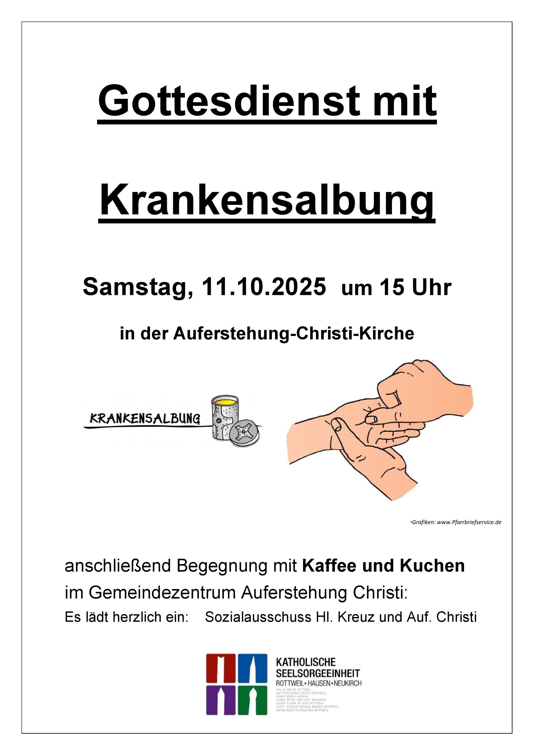 Die Seelsorgeeinheit Rottweil-Hausen-Neukirch  bietet wieder eine Eucharistiefeier mit Krankensalbung an.