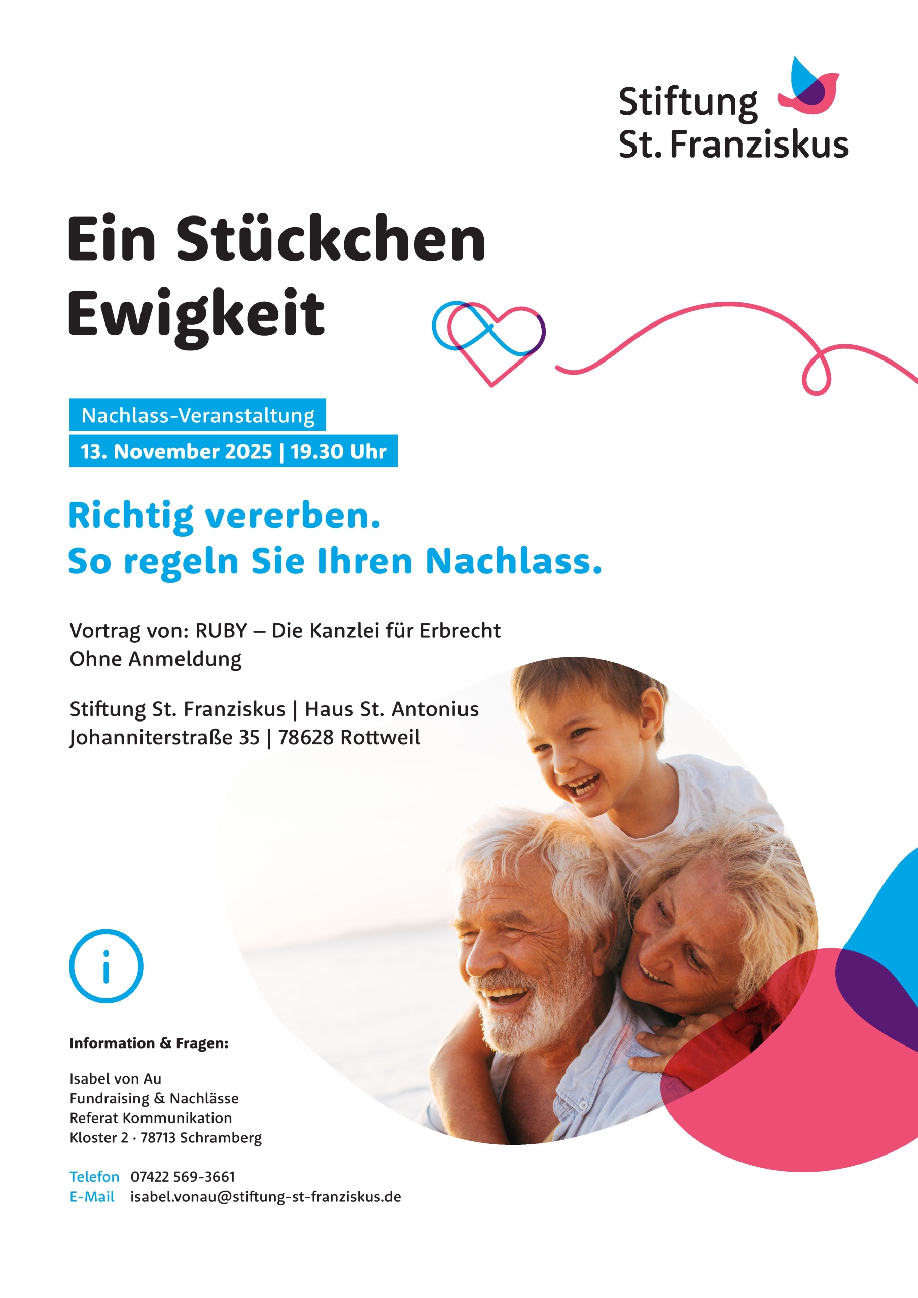 Die kostenlose Veranstaltung mit dem Thema „Richtig vererben. So regeln Sie Ihren Nachlass“ findet am Donnerstag, den 13.11.2025 um 19.30 Uhr im Haus St. Antonius, Johanniterstraße 35 in 78628 Rottweil statt.