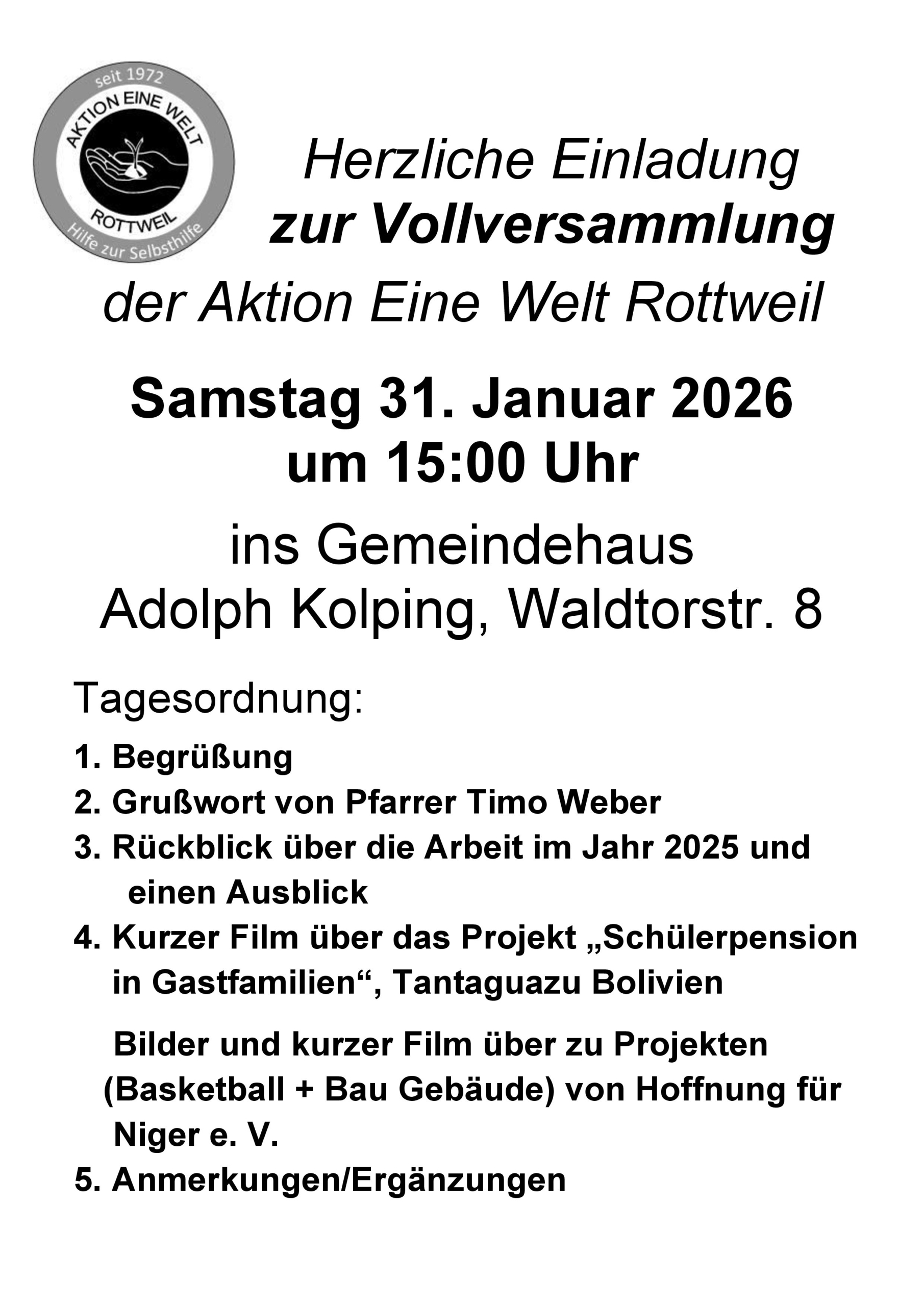 Am Samstag 31. Januar um 15 Uhr findet die diesjährige Vollversammlung der Aktion Eine Welt Rottweil im Gemeindehaus Adolph Kolping statt.