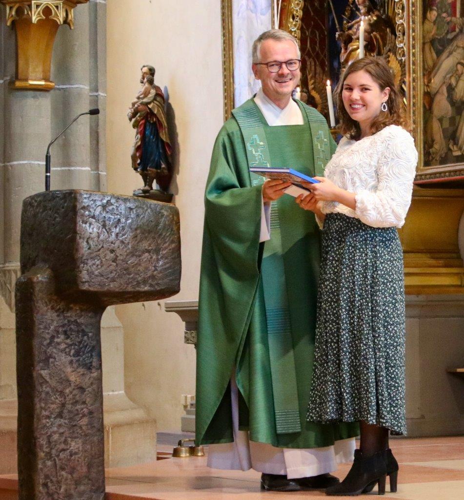 Sie stammt aus Wurmlingen bei Rottenburg, ist 23 Jahre alt und hat ihr Studium in Theologie und Französisch an der Universität Tübingen abgeschlossen. Sie wird nun für drei Jahre in Rottweil sein um ihre Berufsausbildung zur Pastoralreferentin mit der praktischen Arbeit fortzusetzen. Die Berufseinführung endet dann mit der Zweiten Dienstprüfung. Sie sei mit großer Begeisterung auch Sängerin und seit ihrer Kindheit in der Rottenburger Domsingschule aktiv. Eine Sangesprobe gab sie bereits im Gottesdienst, als sie die Antiphonen und das Halleluja vor dem Evangelium sang.