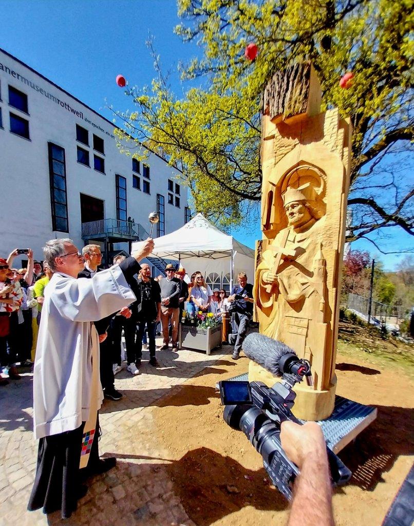 Zur Einweihung der Neckarline, dem neuen Wahrzeichen Rottweils, fand mit Pfarrer Timo Weber und Dekan Ulrich Dewitz ein ökumenischer Gottesdienst im gutgefüllten Festzelt auf dem Berner Feld statt. Anschließend wurde die neue Brücke feierlich gesegnet. Dann durften alle Gottesdienstbesucher zusammen mit den beiden Pfarrern in Prozession über die Brücke zum Bockshof gehen. Dort wurde eine Nepomuk-Skulptur enthüllt und von Pfarrer Timo Weber gesegnet. Die Figur hat der Künstler Michael Tomaszus aus Bad Saulgau aus einer Eiche geschnitzt, die im Bockshof für den Brückenbau gefällt werden musste. Projektleiter Roland Haag hat dem früheren Stadtarchivar Winfried Hecht, der inzwischen verstorben ist, auf dessen Bitte versprochen, aus dem Baum einen Heiligen Nepomuk schnitzen zu lassen. Nach der Legende, die zur späteren Heiligsprechung des Johannes Nepomuk führte, entsprang sein Streit mit König Wenzel IV. dem Ansinnen des Königs, Nepomuk solle das Beichtgeheimnis brechen. Demnach habe der Priester dem König nicht preisgeben wollen, was dessen von Wenzel der Untreue verdächtigte Frau ihm anvertraut hatte. Deshalb habe Wenzel ihn foltern und anschließend 1393 von der Prager Karlsbrücke ins Wasser stürzen lassen. Seine Attribute sind das Kreuz und den Finger auf den Mund.