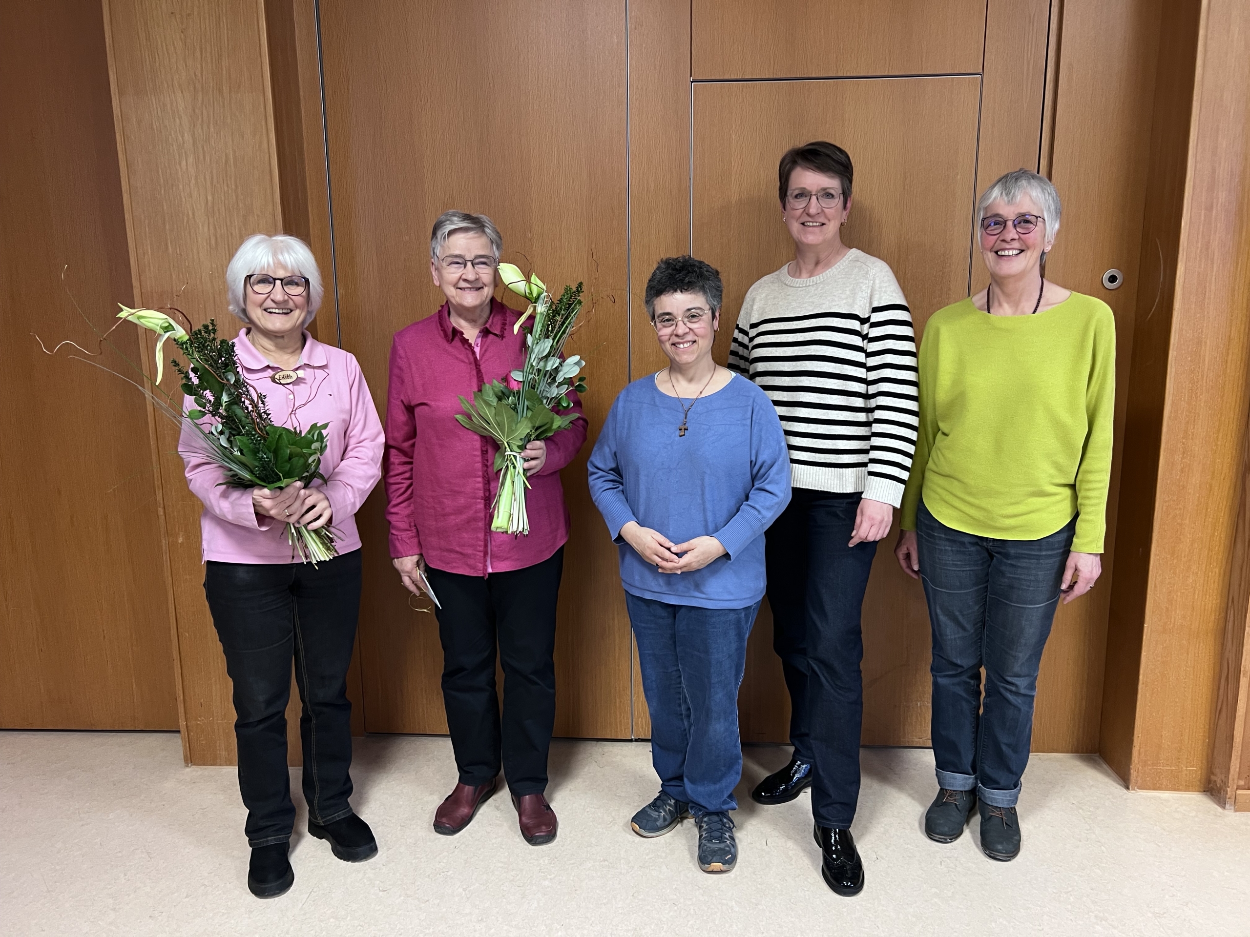 Die Gemeinde würdigte das langjährige ehrenamtliche Engagement der Vorgängerinnen, Gabriele Mohm und Edith Schäfer mit einem Blumenstrauß, einem persönlichen Geschenk und zahlreichen Worte des Dankes. „Auch wenn die Verantwortung nun bei den drei Neuen liegt, werden wir uns auch weiterhin gerne mit Rat und Tat einbringen“, so die feste Zusage der beiden.