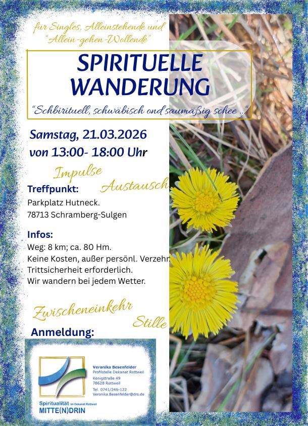 Auftakt hierzu ist am Samstag 21.03.2026 von 13.00 Uhr – 18.00 Uhr. Mit Impulsen, Austausch, Stille, Naturerleben sowie einer Zwischeneinkehr miteinander unterwegs sein und sich dabei mit allen Sinnen anstecken lassen von der wunderschönen Natur und von wunderbaren Menschen … einfach „schbirituell, schwäbisch ond saumäßig schee“!
