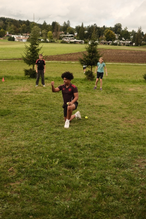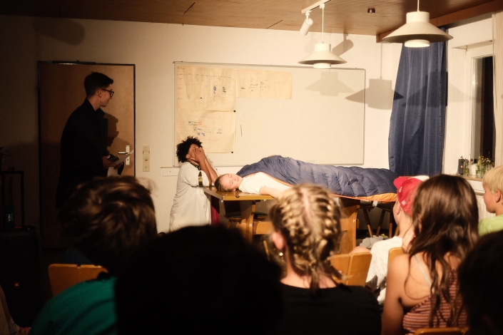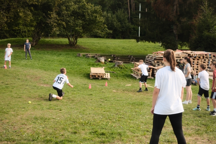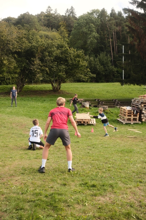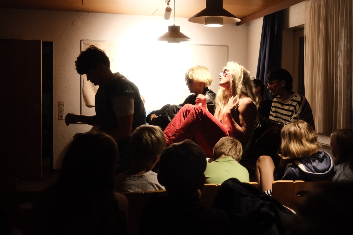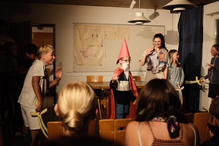 Nun gingen die Kinder in verschiedene Gruppen zusammen, um sich schon morgens auf die festliche Aufführung im Amphitheater ordentlich vorzubereiten. Hierzu wurde sich an verschiedensten mehr oder weniger bekannten Fernsehsendungen inspiriert. Frisch gestärkt von einem leckeren Vesper, wurden noch einige Runden Théque gespielt mit viel Spaß und sportlicher Begeisterung, sodass auch der Sport nicht zu kurz kam. Danach wurde intensiv die Wasserrutsche genutzt, und dann letzte Vorbereitungen für den Bunten Abend getroffen. In der Zwischenzeit erfüllte die Küche einen langersehnten Wunsch: „Mac n‘ Cheese“. Nun im Anschluss war es soweit, dass Highlight des Tages stand an: Die legendären kulturellen Festspiele.