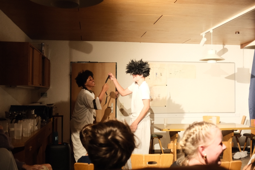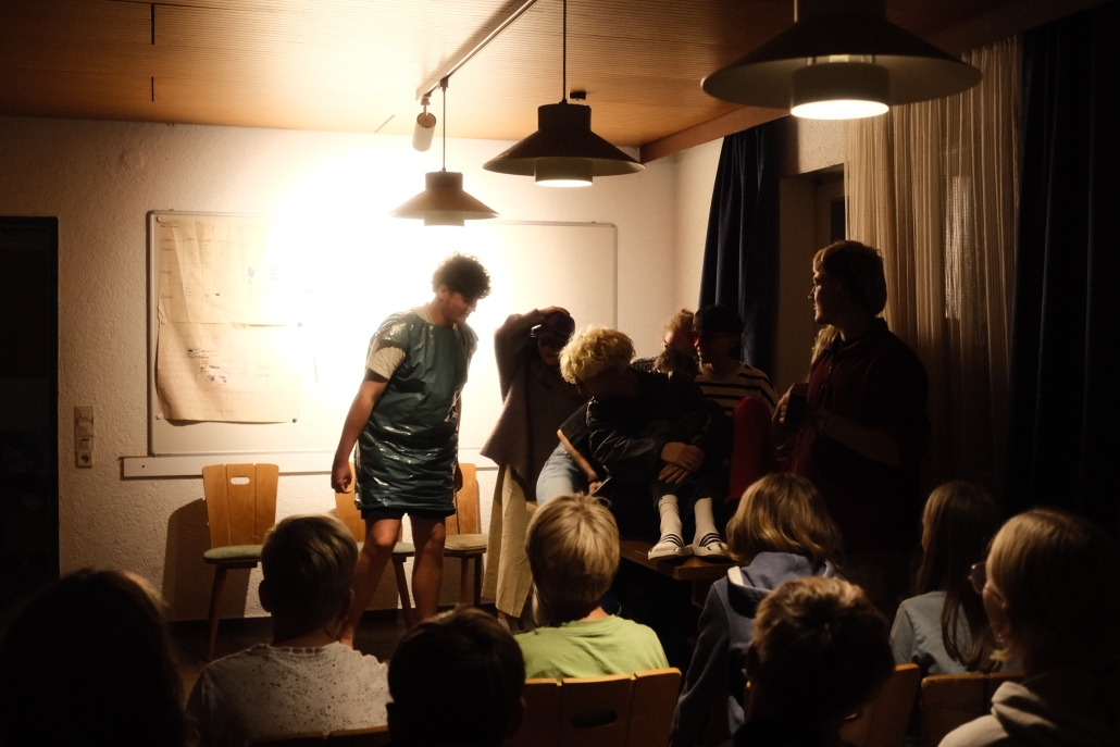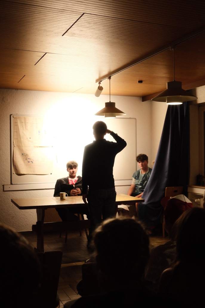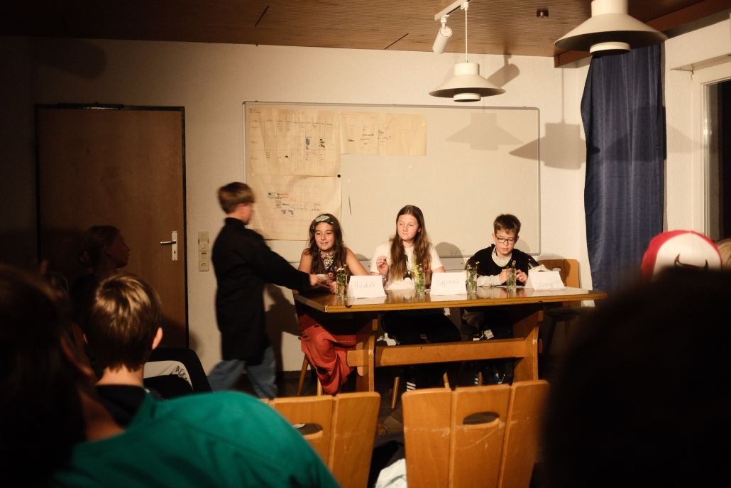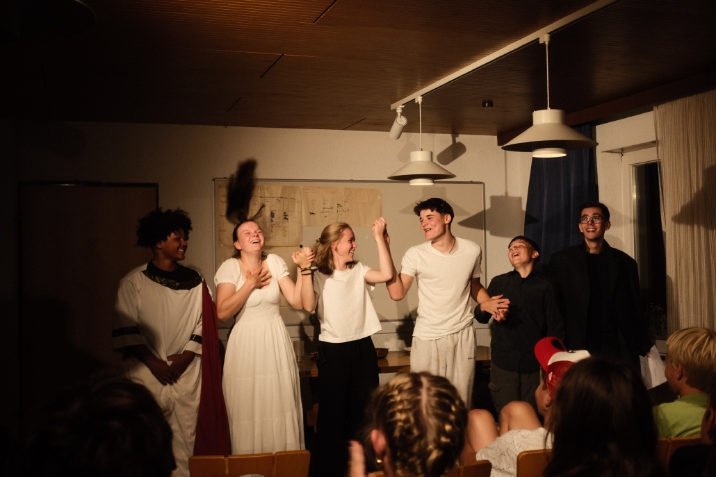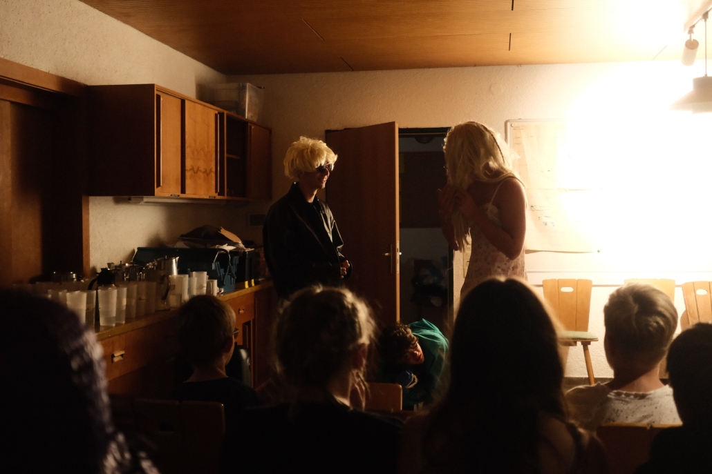 Nun gingen die Kinder in verschiedene Gruppen zusammen, um sich schon morgens auf die festliche Aufführung im Amphitheater ordentlich vorzubereiten. Hierzu wurde sich an verschiedensten mehr oder weniger bekannten Fernsehsendungen inspiriert. Frisch gestärkt von einem leckeren Vesper, wurden noch einige Runden Théque gespielt mit viel Spaß und sportlicher Begeisterung, sodass auch der Sport nicht zu kurz kam. Danach wurde intensiv die Wasserrutsche genutzt, und dann letzte Vorbereitungen für den Bunten Abend getroffen. In der Zwischenzeit erfüllte die Küche einen langersehnten Wunsch: „Mac n‘ Cheese“. Nun im Anschluss war es soweit, dass Highlight des Tages stand an: Die legendären kulturellen Festspiele.