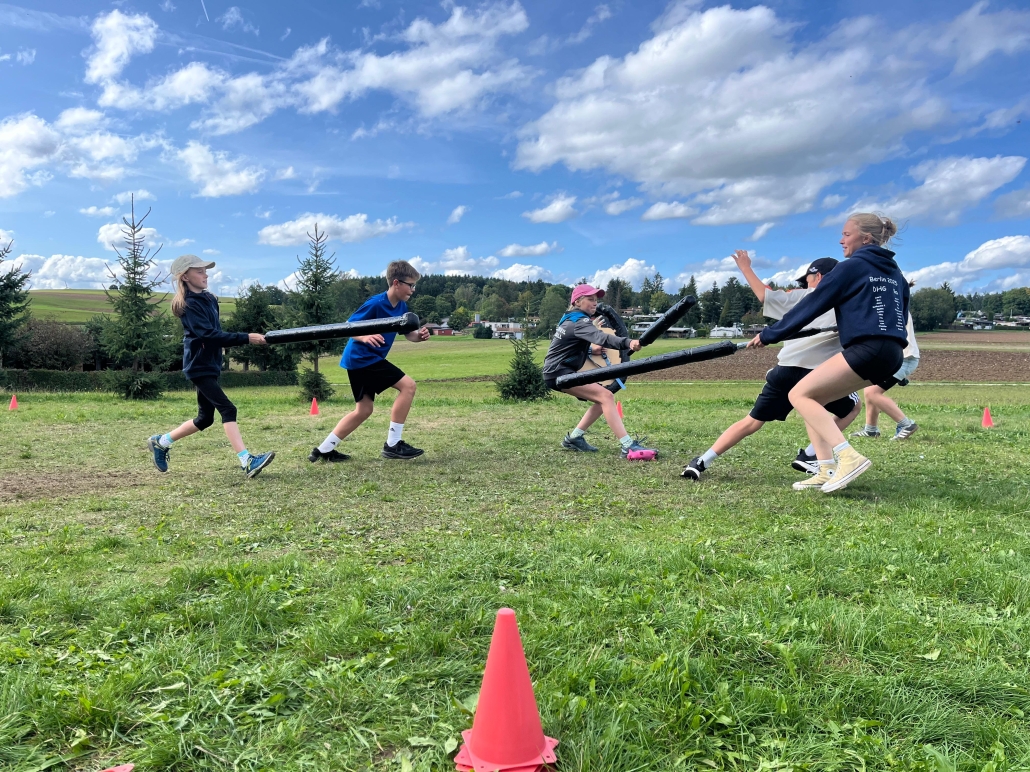 Der letzte volle Tag begann mit einem leckeren Frühstück, das fast so gut war, wie das der Küche die Tage zuvor. Nachdem die Bäuche mit Müsli und Broten gefüllt waren, das Lagerlied noch einmal angestimmt wurde und Elias M als Sonntagsleiter gewählt wurde, ging es schon ab in den Wald. Dort wurde das bereits legendäre Geländespiel „Lignum der Macht“ gespielt, wobei die Kinder allerlei Challenges lösten, Gegner überwältigten und versuchten das Lignum einzunehmen. Gestärkt nach leckerem Resteessen ging es schon wieder weiter mit allerlei Sportspielen. Da in Griechenland gerade die Olympischen Spiele stattfanden und deswegen Griechenland großräumig gesperrt war, blieb uns Galliern als einzige Möglichkeit um das Land zu durchqueren, nur die Teilnahme an den Olympischen Spielen. Somit powerten sich die Kinder bei mehreren Runden Theque, Völkerball, Volley- und Basketball aus. Da heute schon der letzte volle Tag war, durfte natürlich ein festliches Essen mit Lasagne und leckerem Dessert nicht fehlen. Und als krönender Abschluss hatten die Kinder die Chance ihre hart erarbeiteten Grunzpunkte bei einer großen Versteigerung einzusetzen und das ein oder andere schöne Souvenir, Andenken und nettes Mitbringsel zu ergattern. Geschafft aber glücklich fielen die Kinder ein letztes mal in ihren wohlverdienten Schlaf.